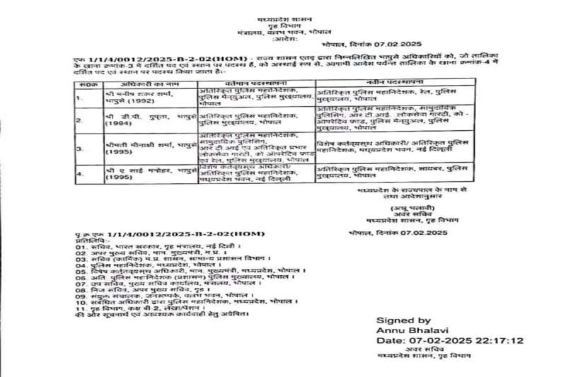 मप्र: सीनियर आईपीएस अफसरों के तबादले, ए.साई मनोहर ADG साइबर सेल नियुक्त