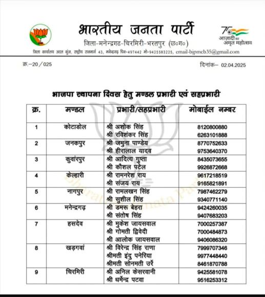रायपुर: 6 अप्रैल 2025 को भारतीय जनता पार्टी का स्थापना दिवस भव्य रूप से मनाने की तैयारी की जा रही है। इसी क्रम में भाजपा जिला अध्यक्ष श्रीमती चंपा देवी पावले की सहमति से जिला एवं मंडल संयोजक एवं सह संयोजकों की नियुक्ति की गई है।