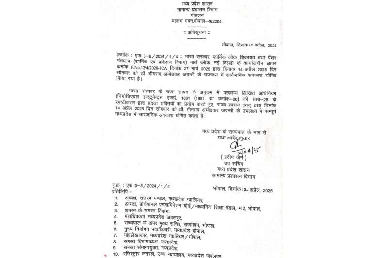 भारत सरकार के उक्त ज्ञापन के अनुक्रम में परक्राम्य लिखत अधिनियम 1881 की धारा-25 के स्पष्टीकरण द्वारा प्रदत्त शक्तियों का प्रयोग करते हुए राज्य सरकार एतद्द्वारा डॉ. भीमराव अंबेडकर जयंती के अवसर पर सोमवार 14 अप्रैल 2025 को संपूर्ण मध्य प्रदेश में सार्वजनिक अवकाश घोषित करती है।