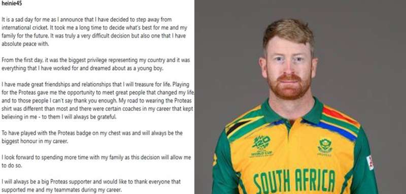 हेनरी क्लासेन ने अपनी रिटायरमेंट की जानकारी इंस्टाग्राम पर दी. उन्होंने इसमें लिखा, "ये मेरे लिए दुखद दिन है, क्योंकि मैंने अब इंटरनेशनल क्रिकेट से दूर रहने का फैसला किया है. मुझे ये तय करने में बहुत समय लगा कि मेरे और मेरे परिवार के लिए फ्यूचर में सबसे अच्छा क्या रहेगा. सच में ये काफी कठिन फैसला था, लेकिन मैं अपने करियर से पूरी तरह से संतुष्ट हूं”. उन्होंने आगे लिखा कि देश के लिए खेलना काफी सम्मान की बात होती है. मैंने बचपन से साउथ अफ्रीका से खेलने का सपना देखा था जो अब पूरा हुआ.