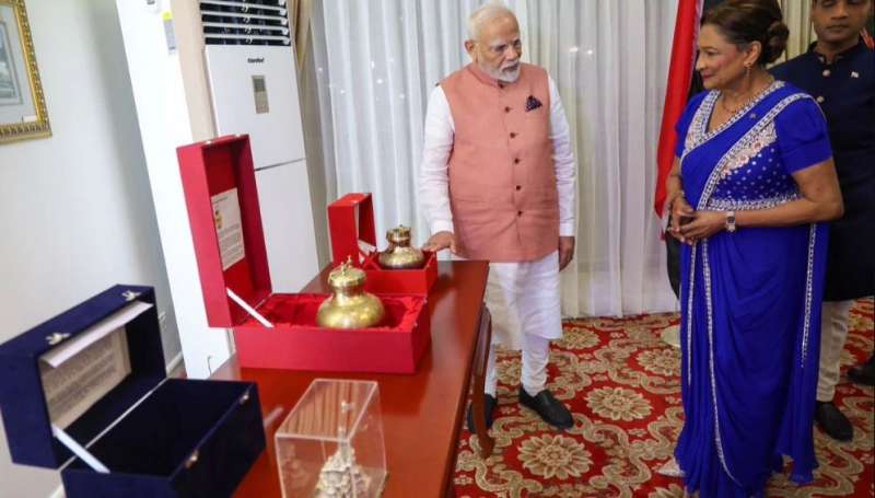नई दिल्ली। पीएम मोदी ने त्रिनिदाद और टोबैगो के पीएम को भारत की आध्यात्मिक विरासत और सांस्कृतिक प्रतीकों के अनमोल उपहार प्रदान किए। पीएम ने त्रिनिदाद एंड टोबैगो की पीएम कमला प्रसाद बिसेसर को अयोध्या में निर्माणाधीन श्रीराम मंदिर की चांदी से बनी भव्य प्रतिकृति और सरयू नदी के पवित्र जल से भरा कलश भेंट किया। ये दोनों उपहार भारतीय संस्कृति, धर्म और आध्यात्मिक मूल्यों का प्रतिनिधित्व करती हैं।