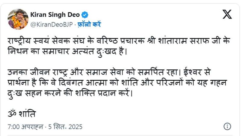मुख्यमंत्री विष्णुदेव साय ने गहरा दुख व्यक्त करते हुए कहा, “शांताराम सर्राफ का जीवन समाज और राष्ट्र के प्रति समर्पण, अनुशासन और प्रेरणा का अद्वितीय उदाहरण है। उनके योगदान को सदैव याद किया जाएगा।”