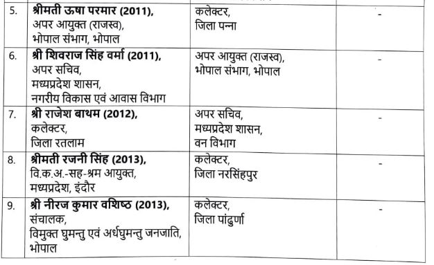 भोपाल। मध्य प्रदेश की मोहन सरकार ने मंगलवार को बड़ी संख्या में आईएएस अधिकारियों को इधर से उधर किया। भारतीय प्रशासनिक सेवा के 24 अधिकारियों को नई जिम्मेदारी सौंपी गई है। इसमें 12 जिलों के कलेक्टर को हटा दिया गया है। इसमें भिंड में विधायक से भिड़ने वाले कलेक्टर संजीव श्रीवास्तव को लोक निर्माण विभाग में अपर सचिव बनाया गया है। वहीं, आईएएस बनने के 14 साल बाद पहली बार कलेक्टर बनीं नेहा मारव्या सिंह को भी हटा कर विमुक्त घुमन्तु एवं अर्धघुमन्तु जनजाति विभाग का संचालक बनाया गया है।