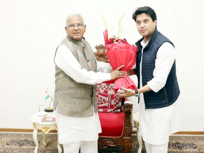 भोपाल। केंद्रीय मंत्री ज्योतिरादित्य सिंधिया भोपाल पहुंचे। एयरपोर्ट पर उनका जल संसाधन मंत्री तुलसी सिलावट, खाद्य एवं नागरिक आपूर्ति मंत्री गोविंद सिंह राजपूत, विधायक डॉ. प्रभुराम चौधरी और कृष्णा घाड़गे ने स्वागत किया।केंद्रीय मंत्री ज्योतिरादित्य सिंधिया ने राज्यपाल राजभवन पहुंचकर राज्यपाल मंगू भाई पटेल से मुलाकात की। हालांकि, इस मुलाकात को शिष्टाचार भेंट बताया जा रहा है, लेकिन इसके राजनीतिक मायने भी निकाले जा रहे हैं।दरअसल सिंधिया नरोत्तम मिश्रा के घर भी पहुंचे थे। सिंधिया चार इमली स्थित पूर्व गृह मंत्री डॉ. नरोत्तम मिश्रा के घर पहुंचे। दोनों नेताओं के बीच करीब 15 मिनट तक बातचीत हुई। इस मुलाकात को लेकर बीजेपी प्रदेश अध्यक्ष चुनाव की चर्चा जोरों पर है।